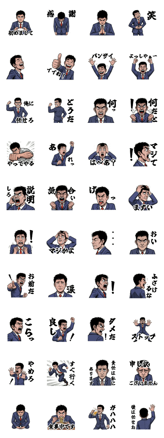 | スタンプ説明 | 熱量たっぷりで仕事に打ち込む泥臭いがかっこいい上司像をスタンプにしました。 |