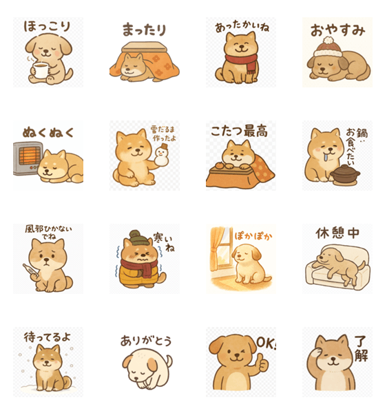 | スタンプ説明 | 寒い冬に心も体も温まる、ほっこりまったりな犬のスタンプです。こたつや毛布、お鍋など、冬の日常で使えるメッセージが満載!「あったかいね」「ぬくぬく」など |