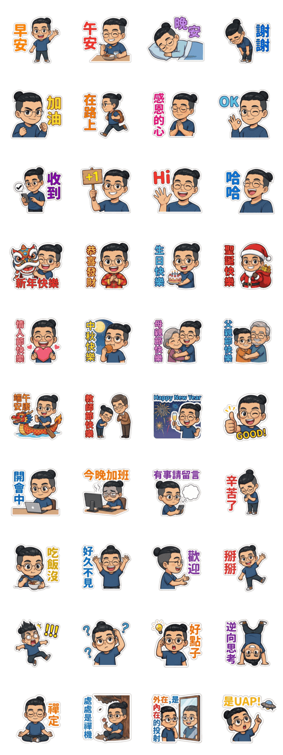 40 stickers! *Daily: Greetings *Holidays: New Year, Xmas, B-day *Work: Meeting, Overtime *Special: Zen & UAP. Covers all your chat needs.