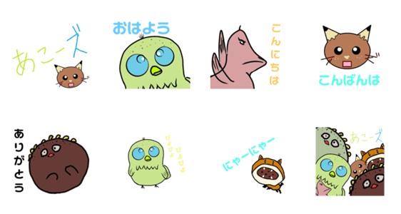 あこーズの公式スタンプです。メインキャラクターのあこにゃんはもちろん、今まで登場してきたキャラクターが大集合したスタンプです。