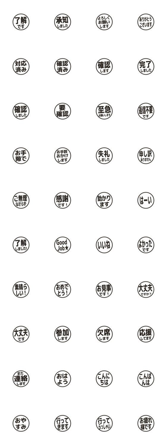 シンプルな敬語のはんこ風スタンプです。文字が主張しない小さめサイズで、余白を多めにしています。会話の流れを邪魔せず、連絡や仕事の返事に使いやすいデザインです。