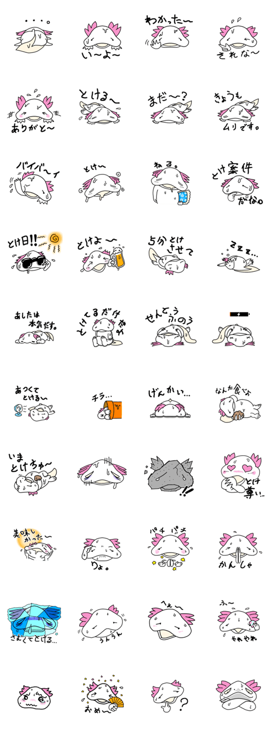 | スタンプ説明 | 少し溶けてるウーパールーパーがあなたに代わってゆるっとトークしてくれるよ。今日も一緒に溶けちゃお〜。 |