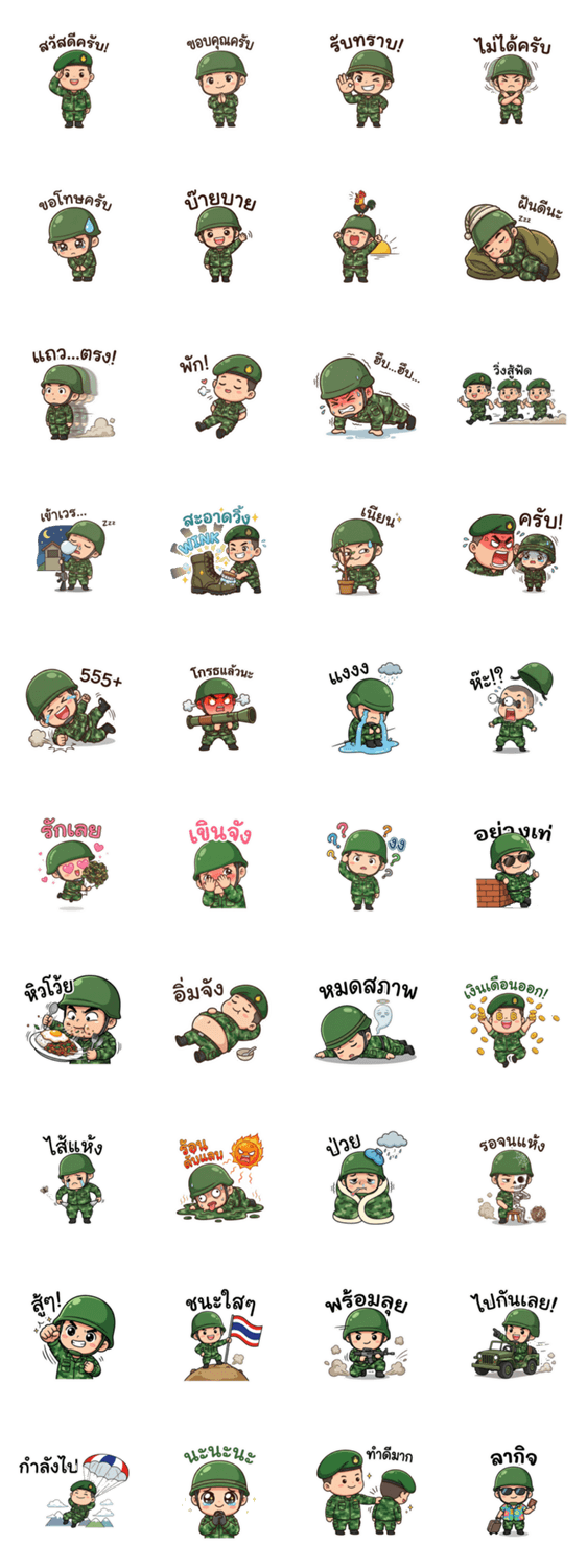 | スタンプ説明 | This sticker set featuring a cute, Chibi-style Thai soldier character in daily life situations. |