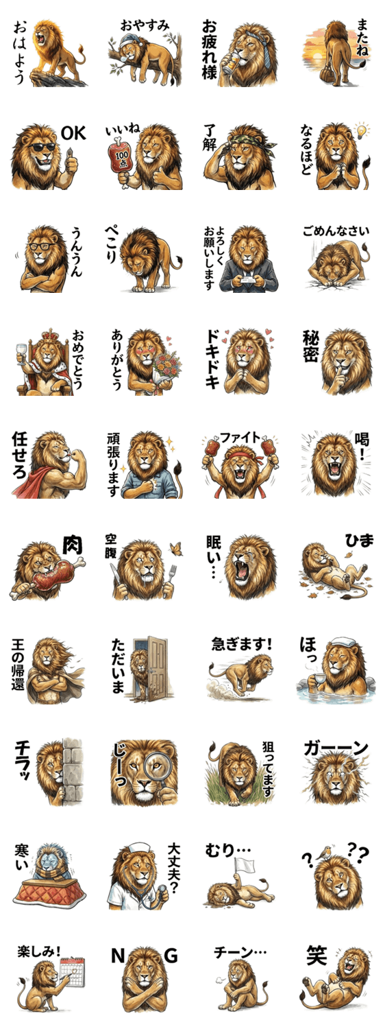 百獣の王ライオンが人間界に降臨!リアルでかっこいい王が日常会話を使いこなすシュールなスタンプ。お祝い、感謝、お疲れ様など、圧倒的な存在感でトークを盛り上げます