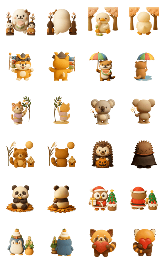 | スタンプ説明 | 紙粘土風のかわいい動物たちが特別コラボ第11弾に登場。 さまざまな季節イベントを組み合わせた癒し系デザイン。 一年を通して楽しく使える紙粘土動物のスタンプです。 |