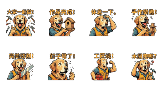 | スタンプ説明 | Liang the golden retriever enjoys woodworking, crafting a warm and happy life. |