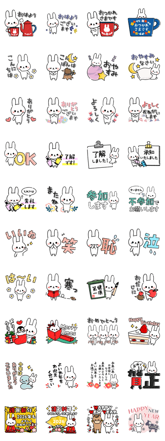 よく使うメッセージうさぎの冬のスタンプです。クリスマス・年末年始・お正月など冬の行事に使えます。年中使える日常の挨拶スタンプもたくさん入ってます。