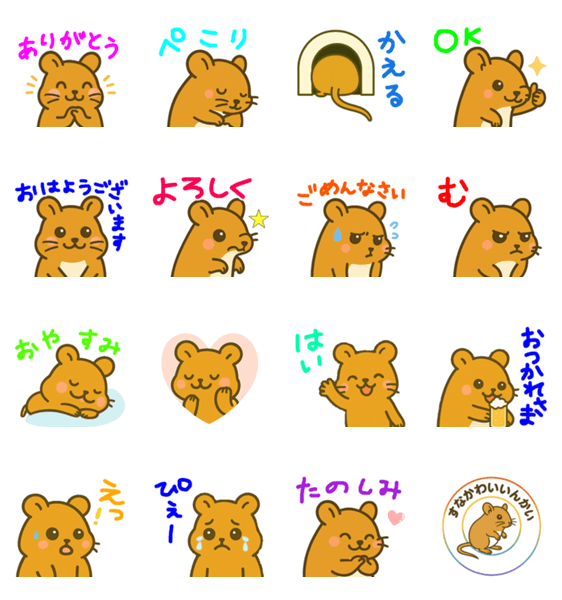 すなねずみかわいい委員会、略してすなかわ委員会。ハムスターじゃないよ。ゆるっとかわいい、毎日使える、女子も子供も大好き、癒し系動物スタンプ。
