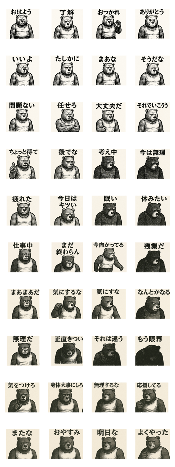 白黒の劇画タッチで描かれた、無口で渋い熊のLINEスタンプ。短パンとタンクトップ姿の熊が、疲れ・仕事・本音・優しさを 最小限の言葉で伝えます。