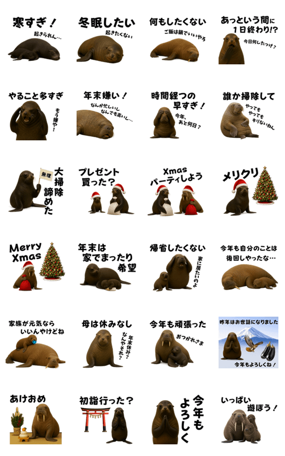 育児・家事・年末年始。 今日も安定のワンオペ。 オットセイ母とセイウチ母が、ママの本音を関西弁で代弁します。 日常・家族・育児トークに使いやすい実用スタンプです。