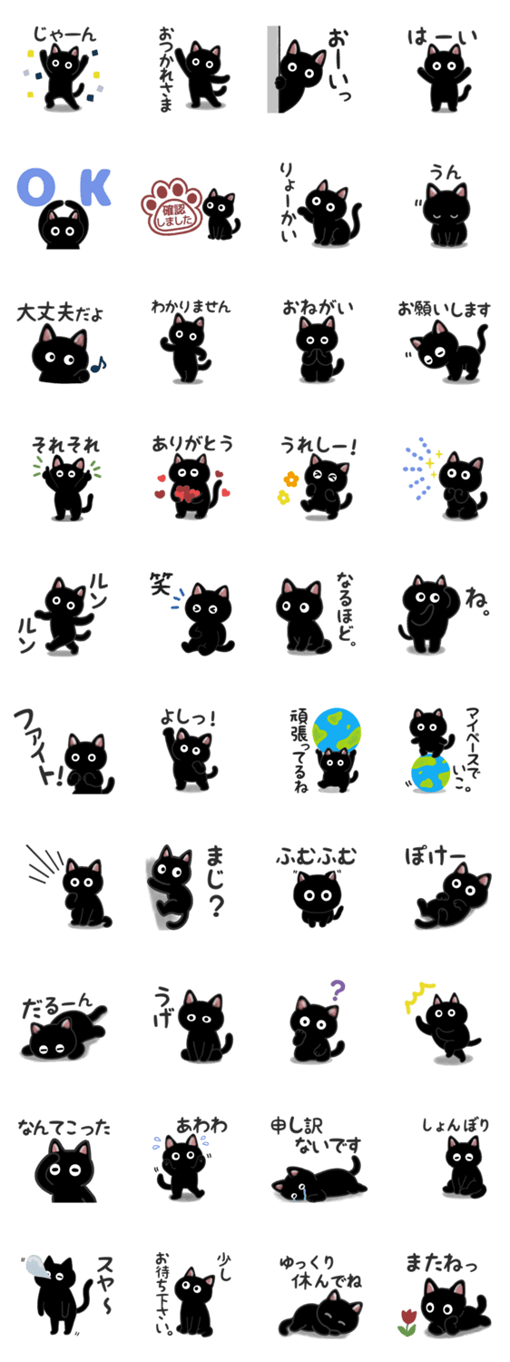まっくろルー。シリーズ第4弾! 返事や気持ちのリアクションなど、 毎日のやりとりでよく使うスタンプを集めました。 日常のいろいろな場面で、気軽に使えるスタンプです。