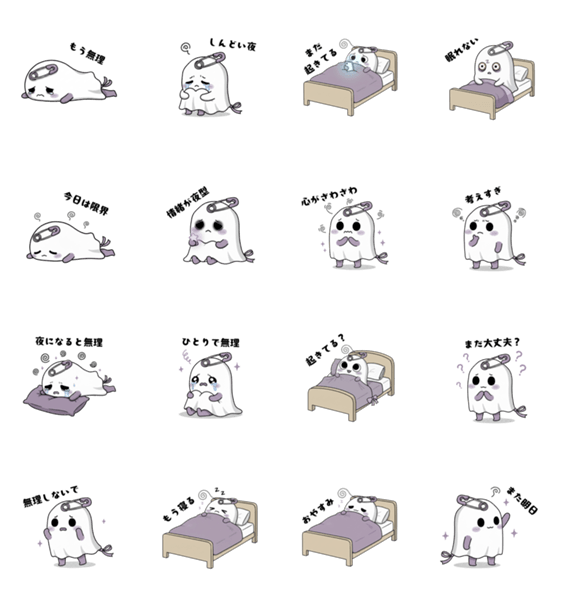 眠れない夜や、ちょっと情緒が不安定な深夜に使える 闇かわおばけのLINEスタンプです。 深夜のトークやひとり時間のお供にどうぞ。