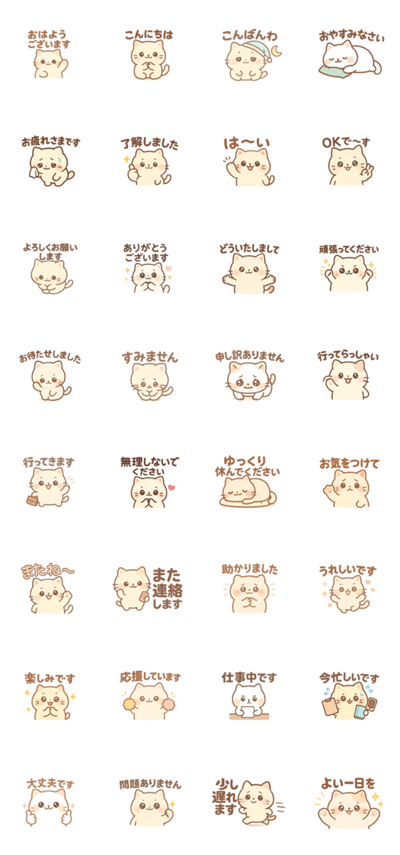 | スタンプ説明 | 毎日使える可愛いネコの日常会話スタンプです。毎日のやりとりを癒しの時間にしてくれるスタンプです。仕事・家族・友達とのトークに添えてお使いください。 |