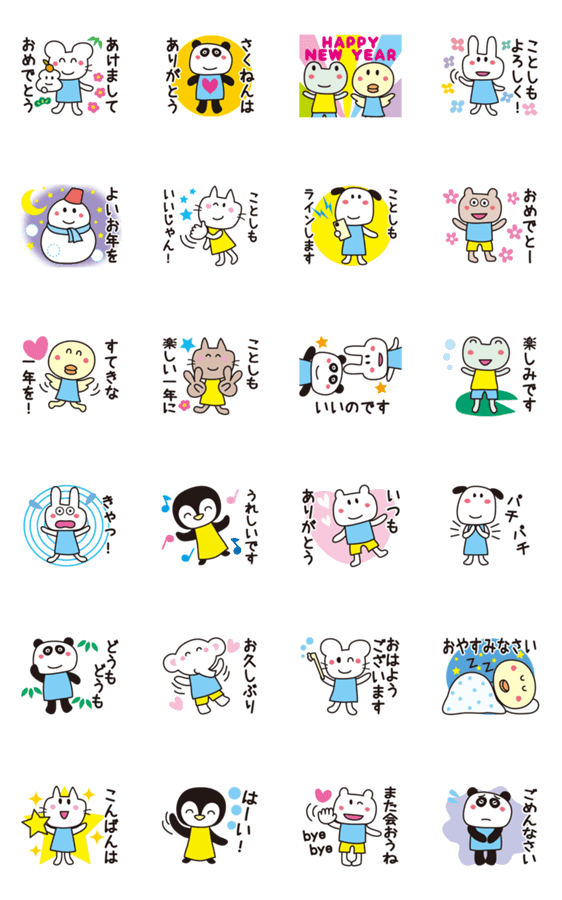 くるくる回ったり、かわいい動きをするキャラクターたちのおもしろい、あけおめスタンプです