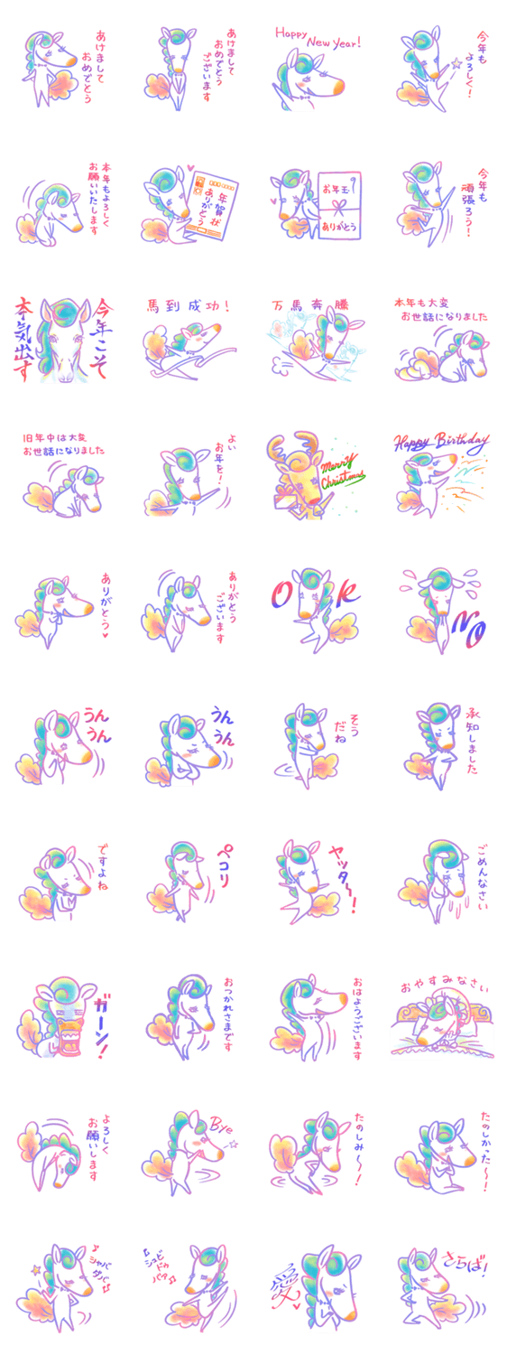 | スタンプ説明 | 歌とダンスが大好きなシャバダバ。 本名:胴馬 朱尾(どうば しゅび) 年末年始のご挨拶に、毎日の連絡に。 ヒヒーンパンに使ってね! 【イラスト:ますっく】 |