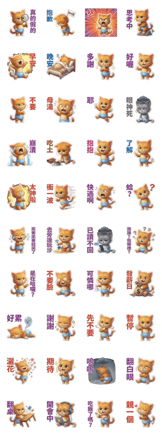 | スタンプ説明 | A playful and energetic orange kitten with exaggerated expressions and highly practical chat phrases. Perfect for jokes, reactions, and daily conversations. |