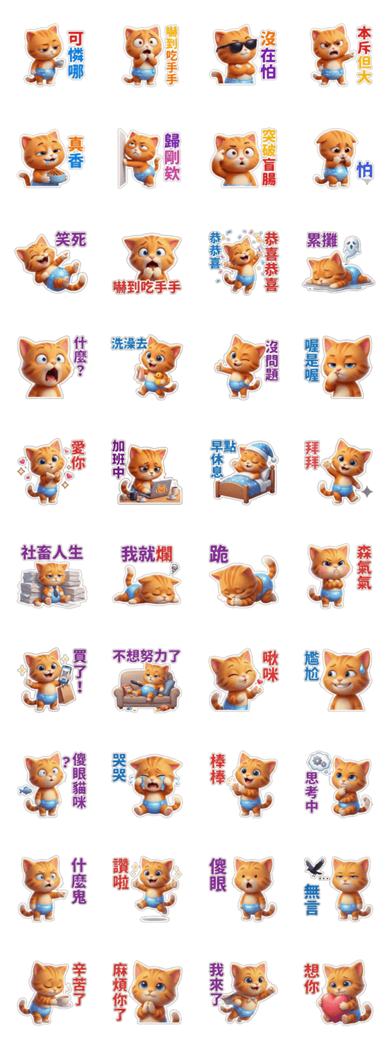 | スタンプ説明 | A playful and energetic orange kitten with exaggerated expressions and highly practical chat phrases. Perfect for jokes, reactions, and daily conversations. |