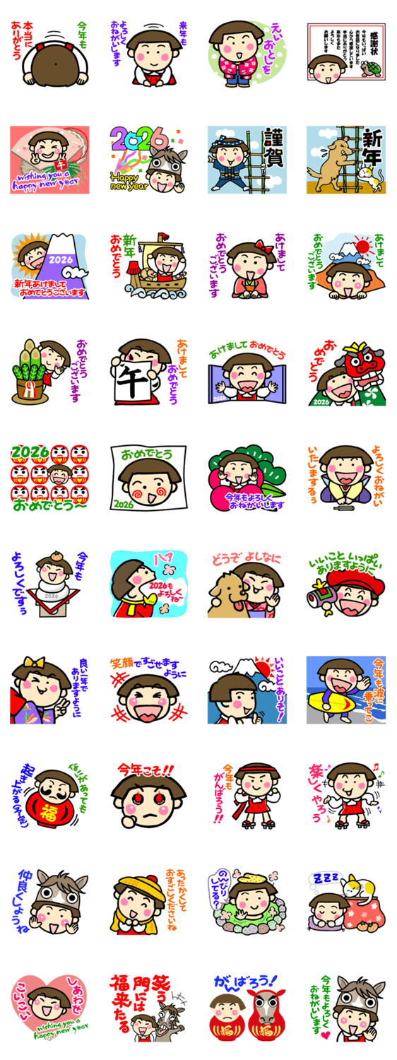 昭和ガール第13弾。2026年午年(馬年)新年明けましておめでとうございます,謹賀新年,今年もよろしくお願いしますや今年の抱負等ユーモラスでほっこり年末年始ご挨拶スタンプ