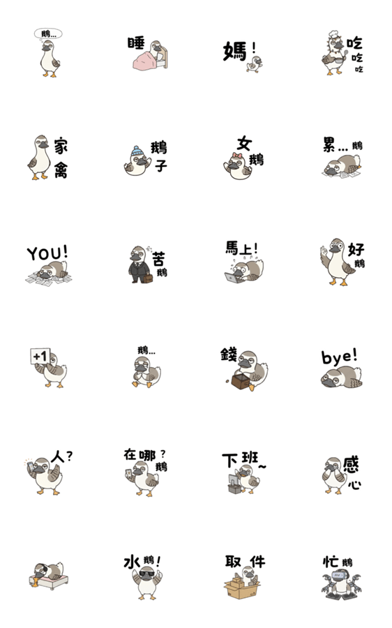 A grey goose with "lifeless, cynical eyes." Design core lies in a nonsensical atmosphere, "half-asleep, half-awake, and full of questions about the world."
