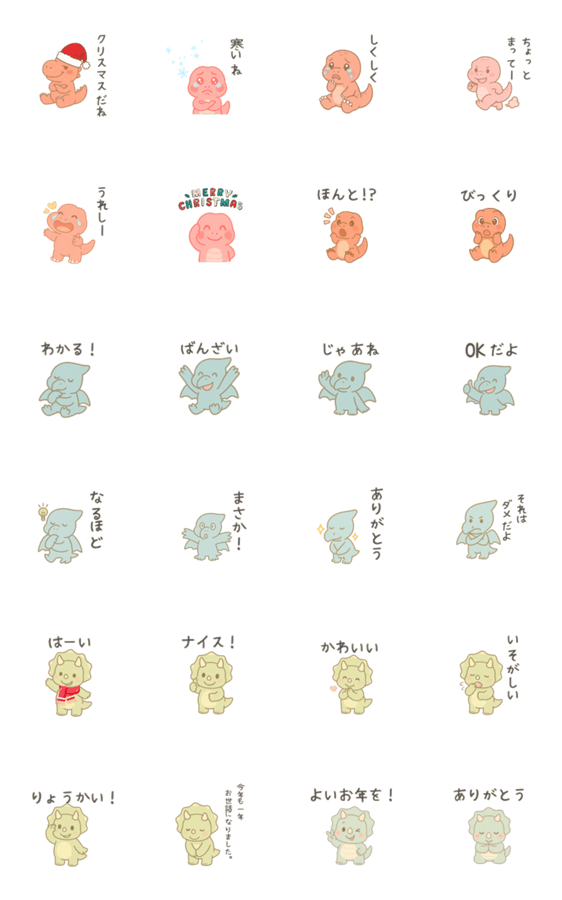 | スタンプ説明 | Cute and gentle dinosaur stickers for everyday chats. Perfect for greetings, reactions, and warm messages. |