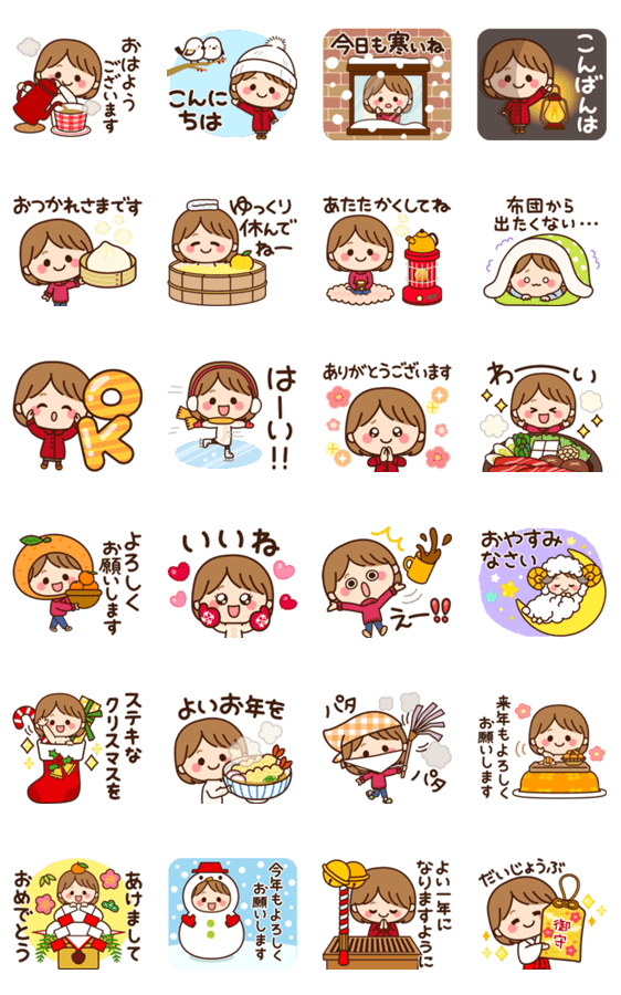 毎年OKなふわちゃんの可愛い冬スタンプ♡クリスマス・年末年始・お正月の挨拶に♩みんなに使える♡かわいい・女の子・シンプル・寒い・あけおめ・敬語・日常・年賀状・家族