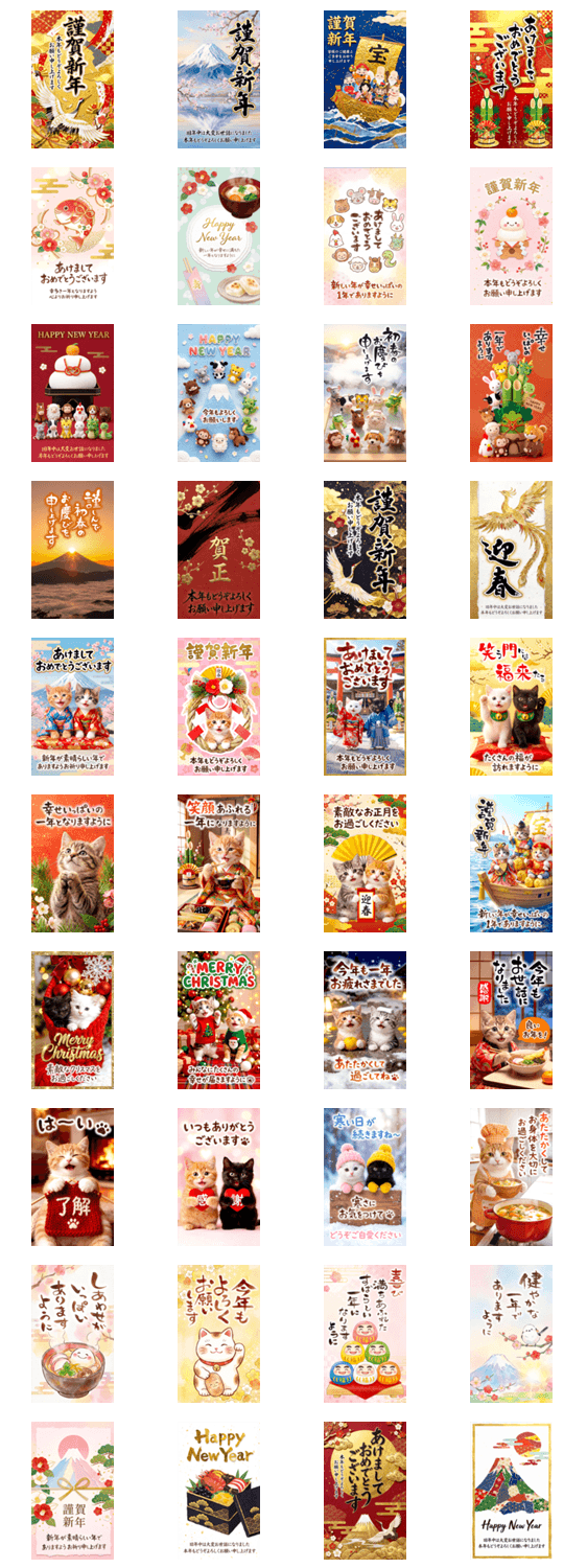 | スタンプ説明 | 毎年使える大人の年賀状&猫のお正月BIGスタンプ♪ (ネコ・敬語・挨拶・年末年始・あけおめ・正月・年賀状・クリスマス・大晦日・干支・十二支・七福神・華やか・筆文字) ※このスタンプはトークルームで大きく表示されるBIGスタンプです。 |
