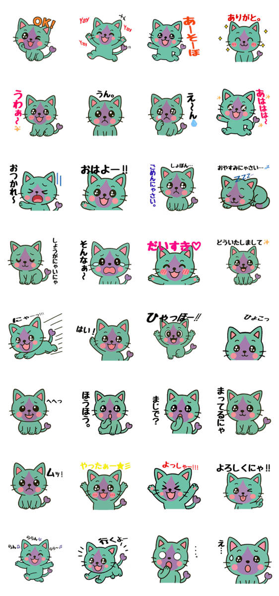 ミントグリーンのねこ「ミントにゃん」が、喜怒哀楽を全力で表現!「OK!」「ありがとう」「おつかれ〜」など、毎日のトークで使いやすいリアクションがたっぷり。