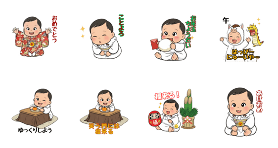 | スタンプ説明 | 小さな女の子が迎える、はじめてのお正月を描いたスタンプです。晴れ着姿やうれしそうな表情が、季節のトークをあたたかく楽しく彩ります。 |