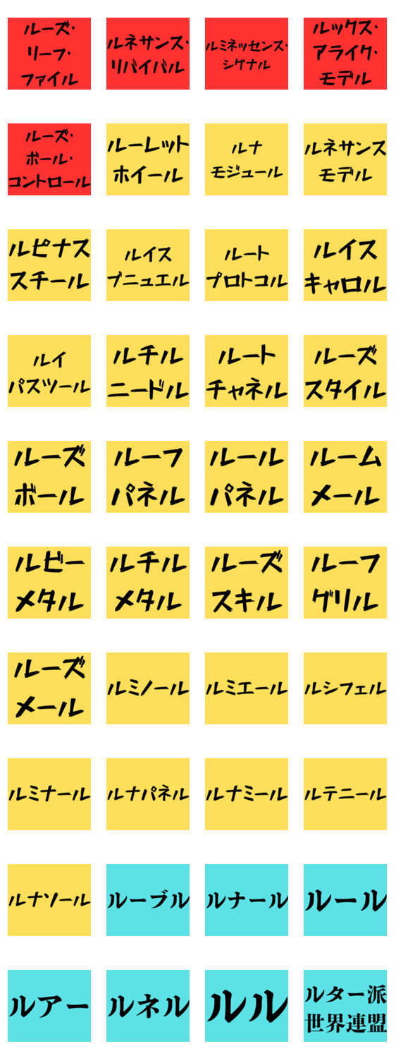 しりとりの「る」攻め対策スタンプ!「る」から始まる言葉を網羅し、急な「る」にも即答できます。逆に「る」で終わる言葉で反撃も!友達とのしりとりを有利に進めよう。