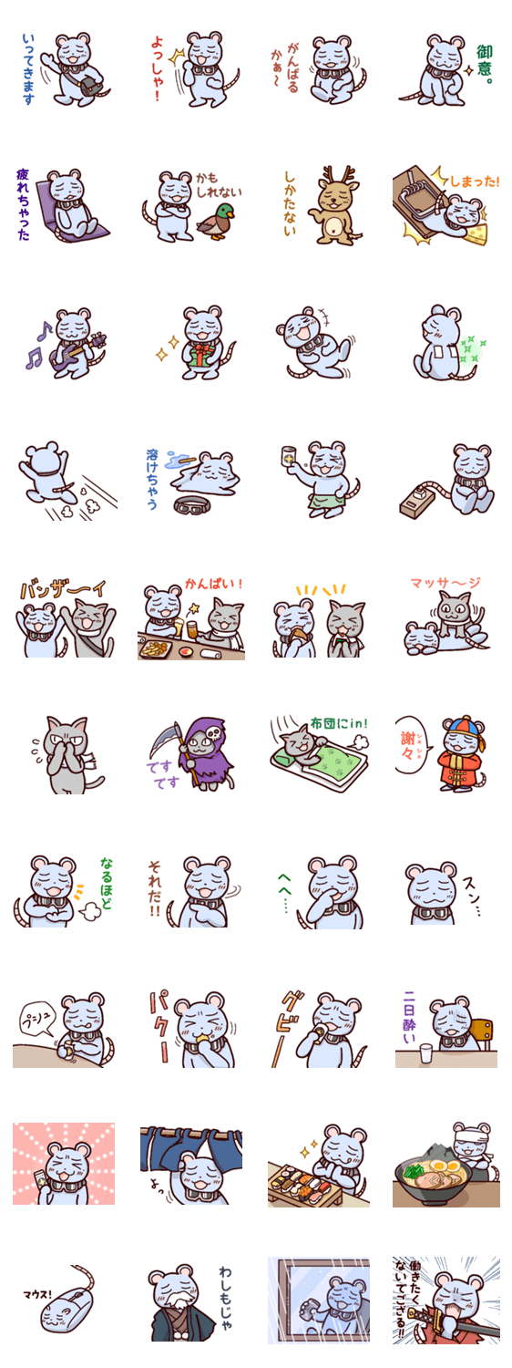 | スタンプ説明 | お酒が大好きなネズミ、アルチュータのスタンプ第2弾です!今回は猫のブーチィも少しだけ一緒に!お酒好きの方におすすめです! |