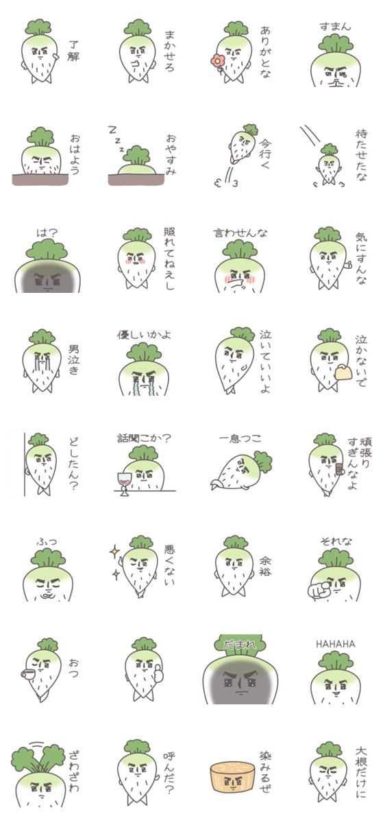 ヒゲの生えた顎の長いだいこんのスタンプです。関連用語:日常/シュール/かわいい/ゆるい/きもかわ/ネタ/面白い