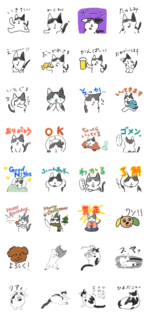 ハチワレねこアグのスタンプ。いろんなテイストのアグが楽しめる。たまにトイプードルのクーとミルが登場する。