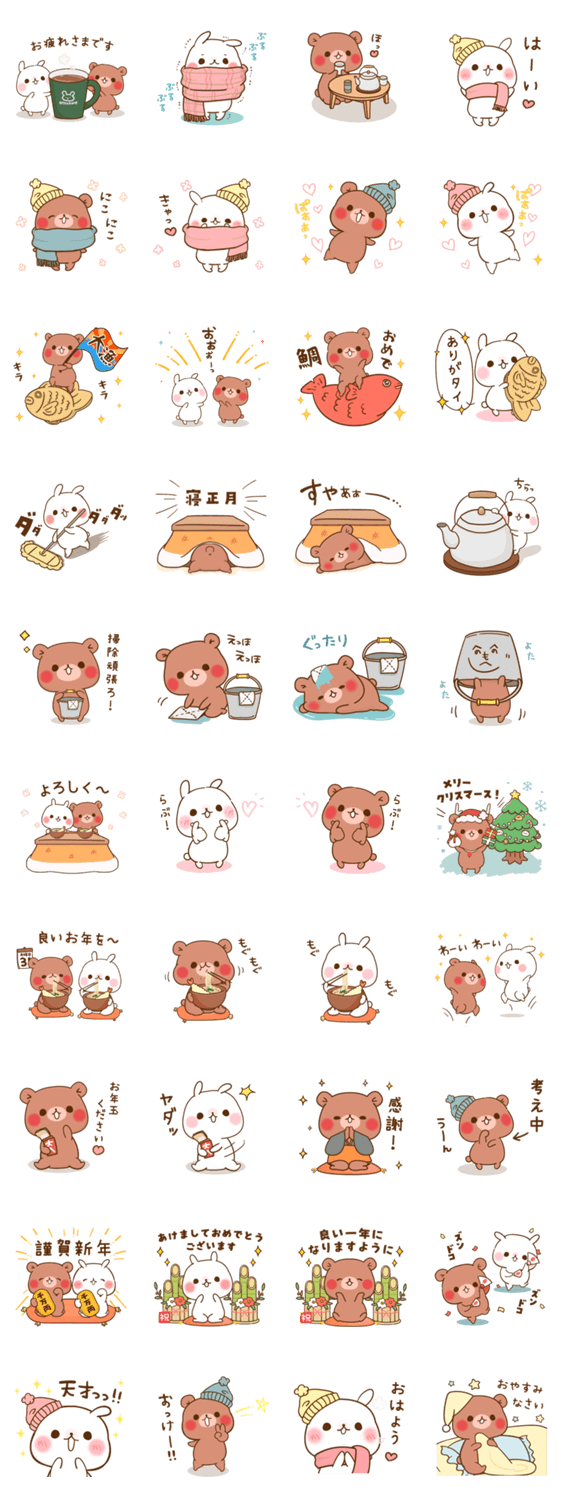 ちいさくてかわいいクマとウサギ「ちびくま」ちゃんと「ちびうさ」ちゃんの年末年始&お正月スタンプ♪ Xmasやお正月などにつかえる挨拶や、冬向けの絵柄が盛りだくさん!