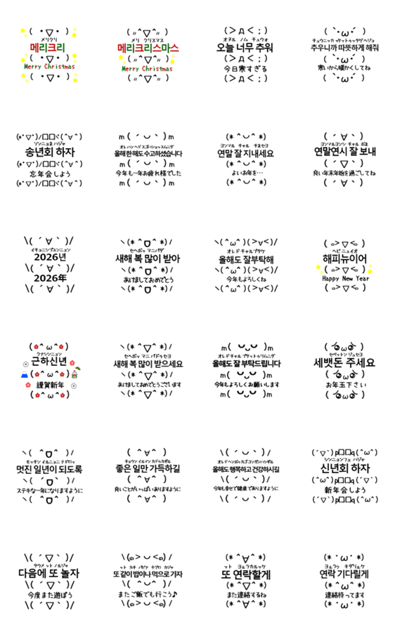 韓国語と日本語スタンプ。ふりがな(ルビ)付き。シンプルで使いやすい◎顔文字/ハングル/敬語/冬イベント/毎年使/クリスマス/お正月/年末年始/あけおめ☆動くver.も発売中♪