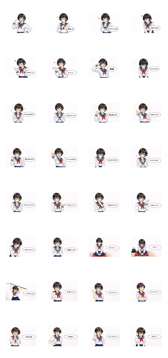 桜町高校2年生・あかねさんの、礼を重んじる和風で丁寧な言葉づかいのLINEスタンプです。日常会話から改まったやり取りまで、落ち着いたやさしさを添えたいときにどうぞ。