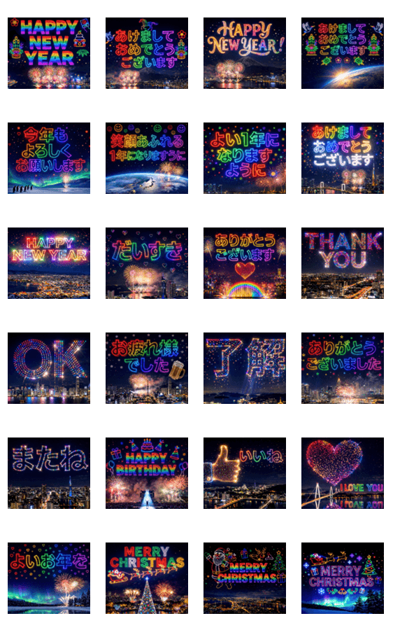 ドローンをイメージした光の演出で描かれた、ポップアップスタンプです。年賀状を中心に、日常の「ありがとう」や「またね」、クリスマスなどさまざまなシーンで使えます。