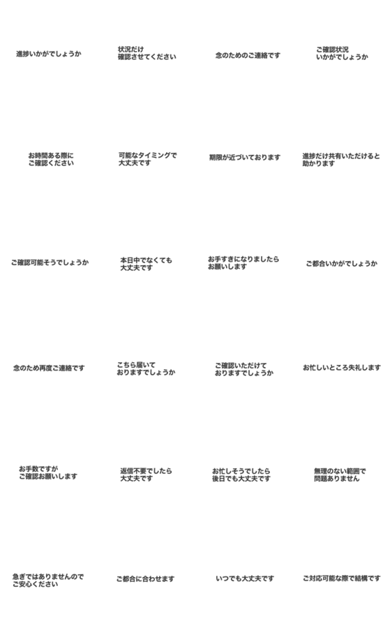 確認や返答のお願いを角が立たずに伝えられる催促用スタンプ24個。ふんわり丁寧な表現で、仕事の進行をスムーズにします。