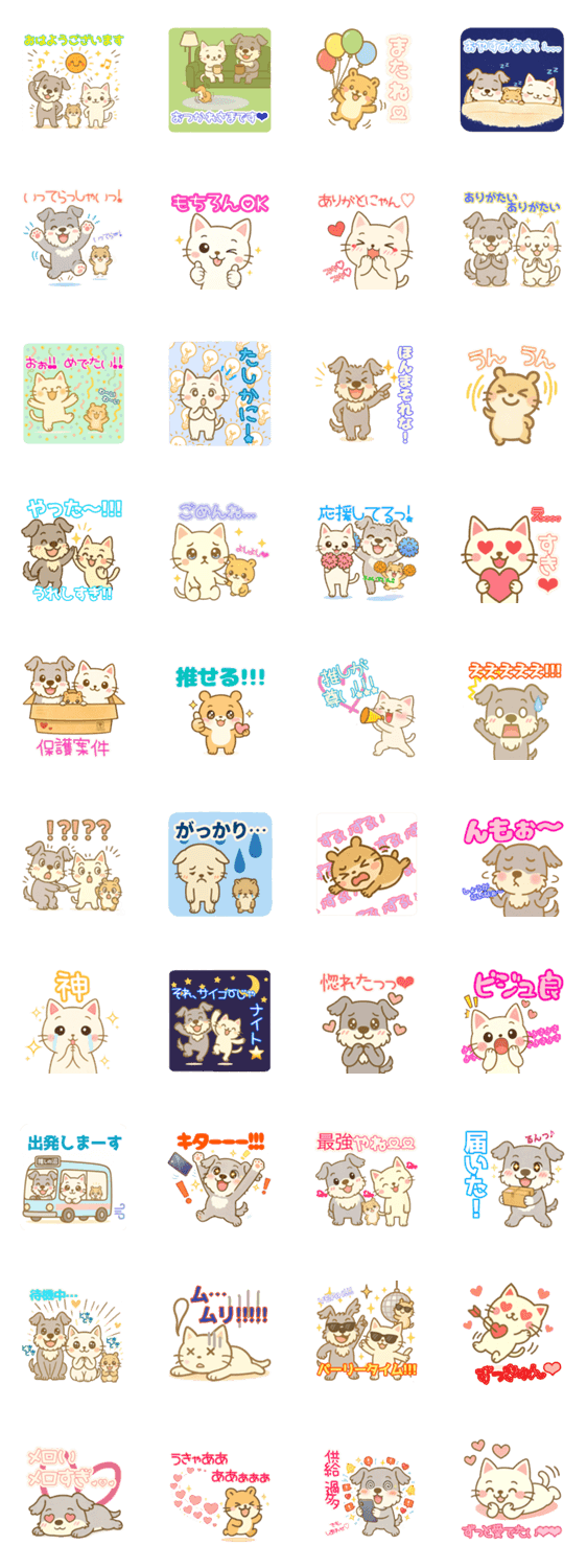 うなちゃん(シュナウザー)、ちゃぴ(白ネコ)、スタオ(ハムスター)の推し活にも日常会話にも使えるスタンプです。 感情表現・あいさつなど、毎日使いやすいセット!