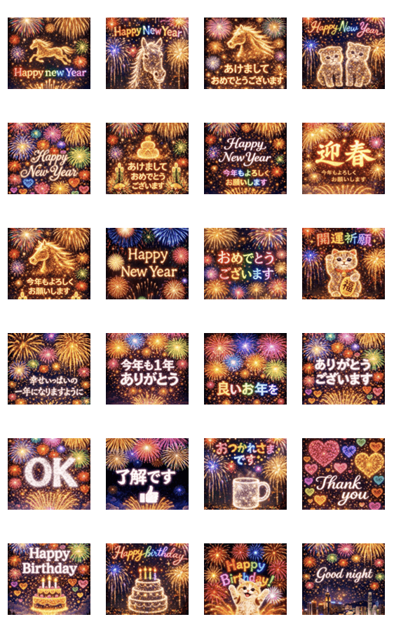 夜空に打ち上がる豪華な花火、お正月・年末年始のご挨拶から日常会話・誕生日まで幅広く使えます。午年・猫