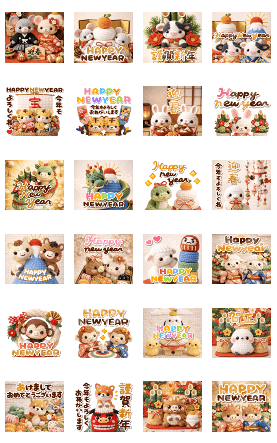 ほっこり可愛い♪年末年始に大活躍♡可愛いあみぐるみの十二支の動物達が豪華に飛び出して動く!ポップアップあけおめスタンプです。干支 子丑寅卯辰巳午未申酉戌亥