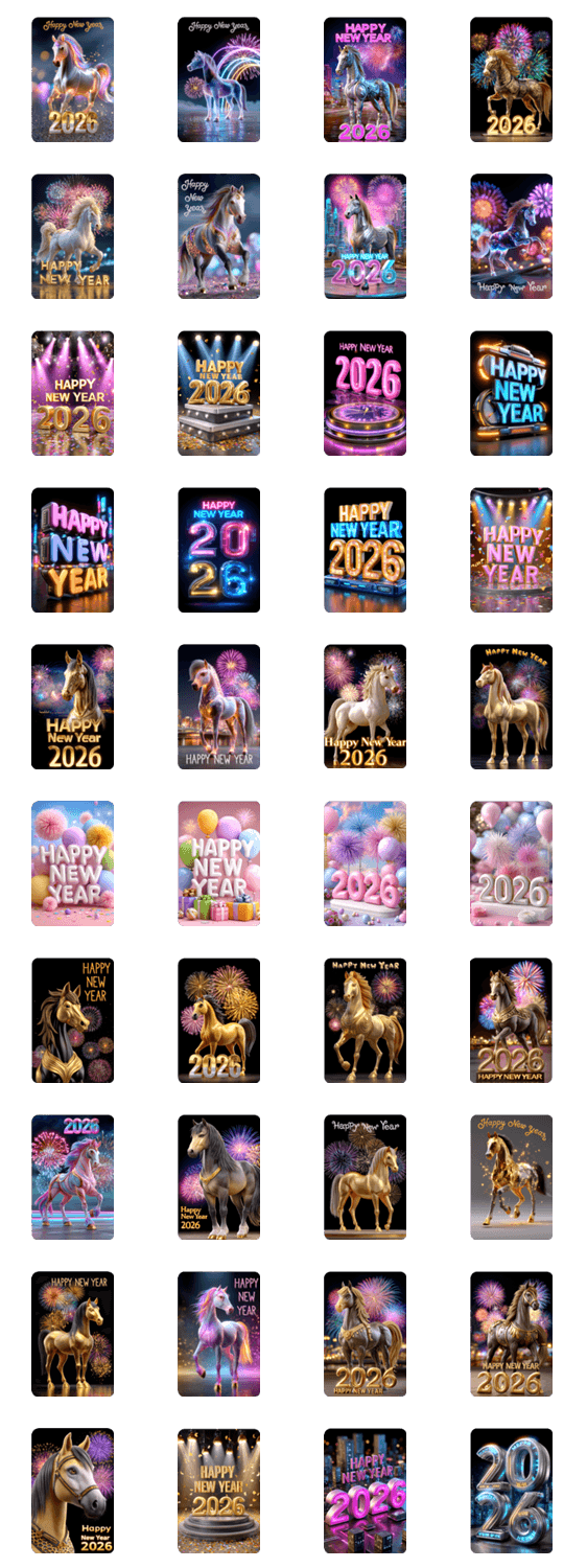 | スタンプ説明 | かわいい馬のハッピーニューイヤー 2026年・2569年、午年、新年のご挨拶、ホリデー、キュート、フェスティバル、カラフルなモダン3Dデザイン 大きなステッカー ※このスタンプはトークルームで大きく表示されるBIGスタンプです。 |
