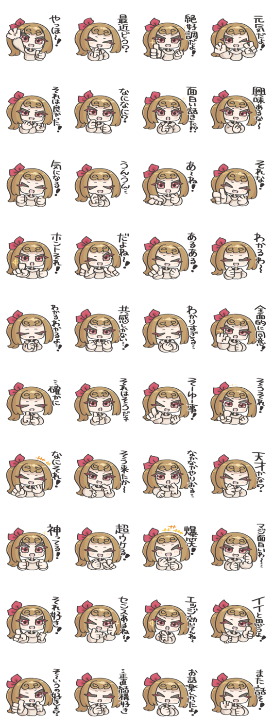 | スタンプ説明 | 茶髪サイドテールの女子らしい女子キャラクターの、ミニキャラ+台詞のスタンプ。毎日の日常会話で使える肯定的・ポジティブな返答、リアクション表現多め。 |