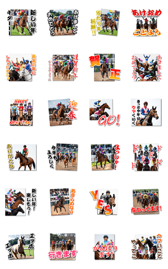 馬がいっぱい午年の楽しい実写風の新年スタンプ!架空の競馬騎手のお正月の挨拶やリアクション・ダジャレ・日常会話もありで意外と使いやすい◎