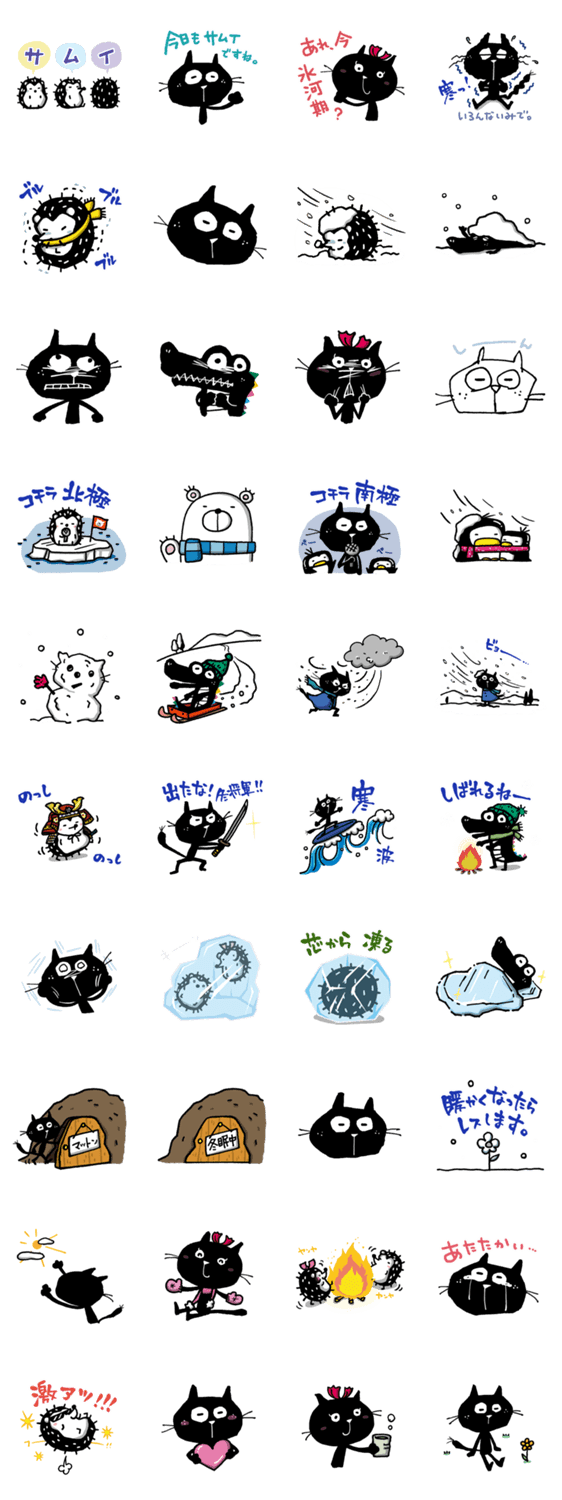 気温が、ギャグが、懐が、心が、サムい時に使える、寒い&ちょっと暖かいスタンプです。黒猫のマットンと仲間のワニ君、ハリネズミ達が繰り広げるスタンプシリーズ第7弾。
