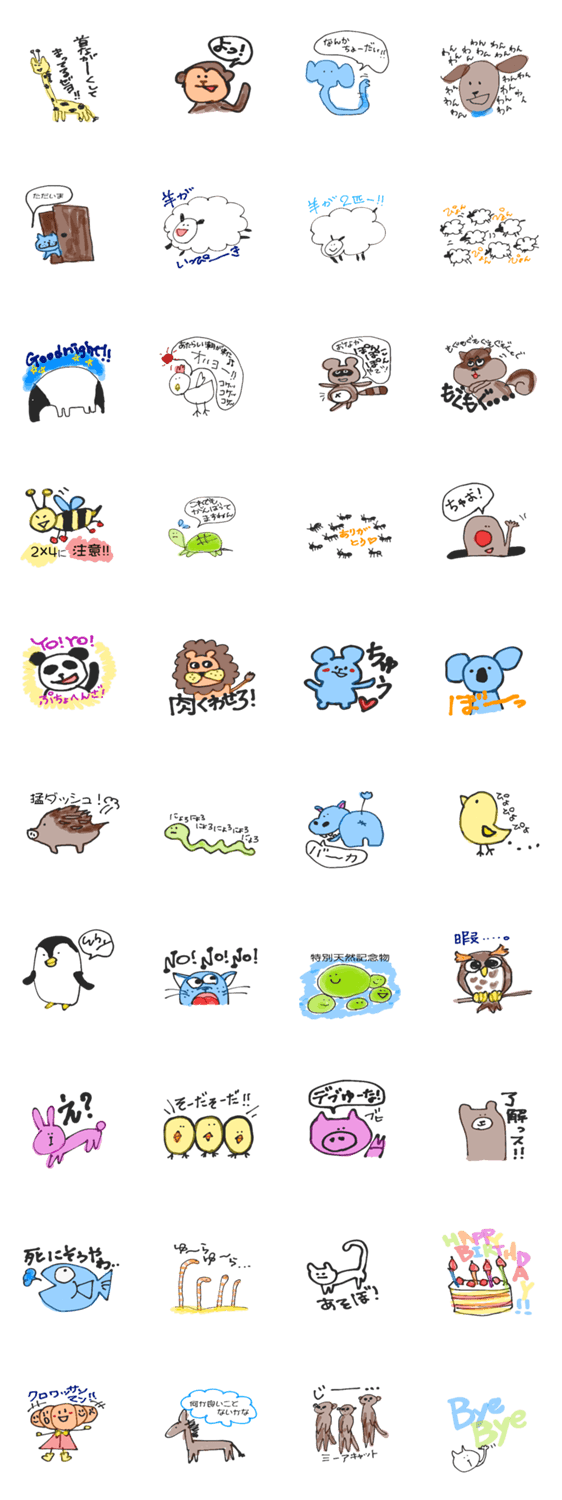 | スタンプ説明 | いろんな動物を適当に書いてみた。チンアナゴ、サル、うさぎ、ねこ、いぬ、きりん、いのしし、かば、ミーアキャット、、などなど。一匹クロワッサンマンも登場するよん♥ |