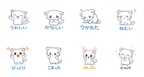 うれしい、かなしい、ねむい、ぷんぷんなど、毎日の気持ちを表現できる白ネコのスタンプです。やさしい表情で、日常のトークに使いやすいセットです。