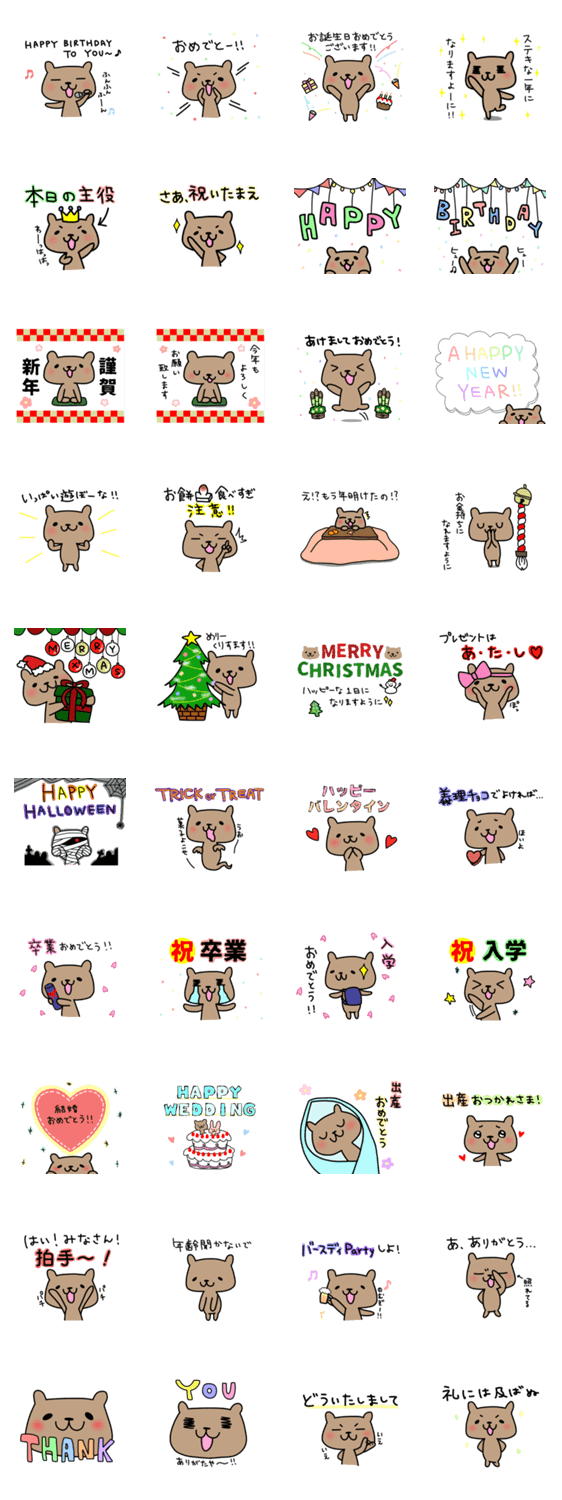 | スタンプ説明 | あのたれ目くまさんのお祝い・イベント編が遂に登場!誕生日・正月・クリスマス・ハロウィン・バレンタイン・入学・卒業・結婚・出産、たくさんのおめでとうを揃えました! |