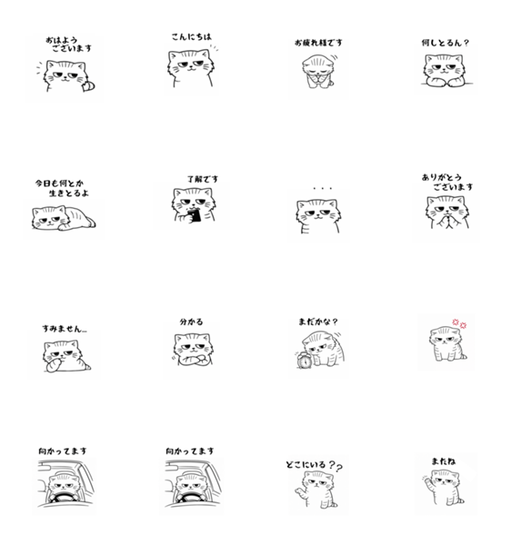 A calm and slightly grumpy cat for everyday chats. Simple line art stickers with greetings, questions, and subtle emotions for family use.