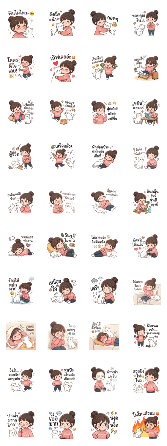 | スタンプ説明 | 甘いセーターを着た小さなお団子ヘアの女の子と彼女の白い猫、 かわいい女の子スタンプ、 かわいい子猫スタンプ、 2D スタンプ |