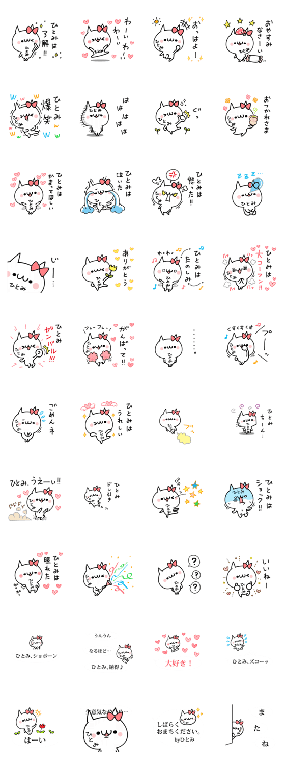 ひとみさん(ヒトミさん)のための名前スタンプです。下の2行は白の吹き出しになっているので、白背景以外を推奨します。